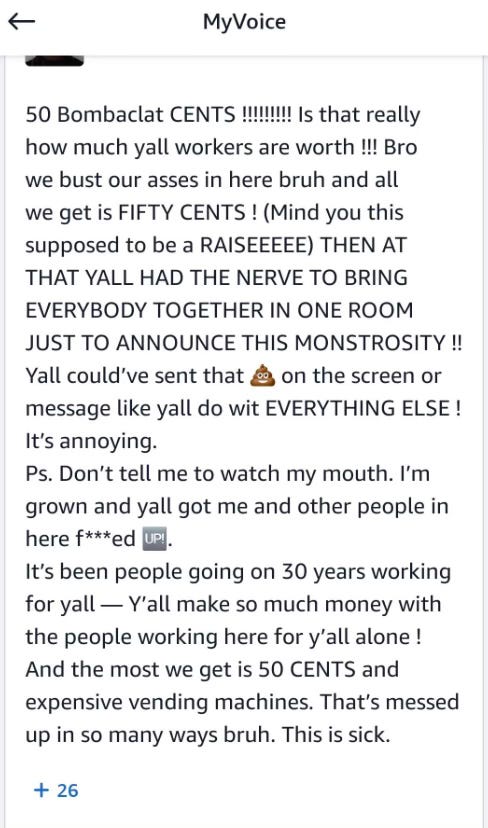 Another worker complained on the company’s internal messaging board over a paltry 50 cent raise.