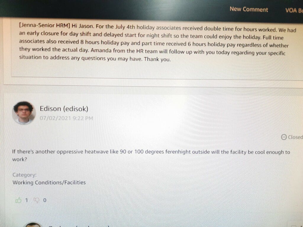"If there's another oppressive heatwave like 90 or 100 degrees Fahrenheit outside, will the facility be cool enough to work?" Edison, an Amazon employee, wrote to HR.