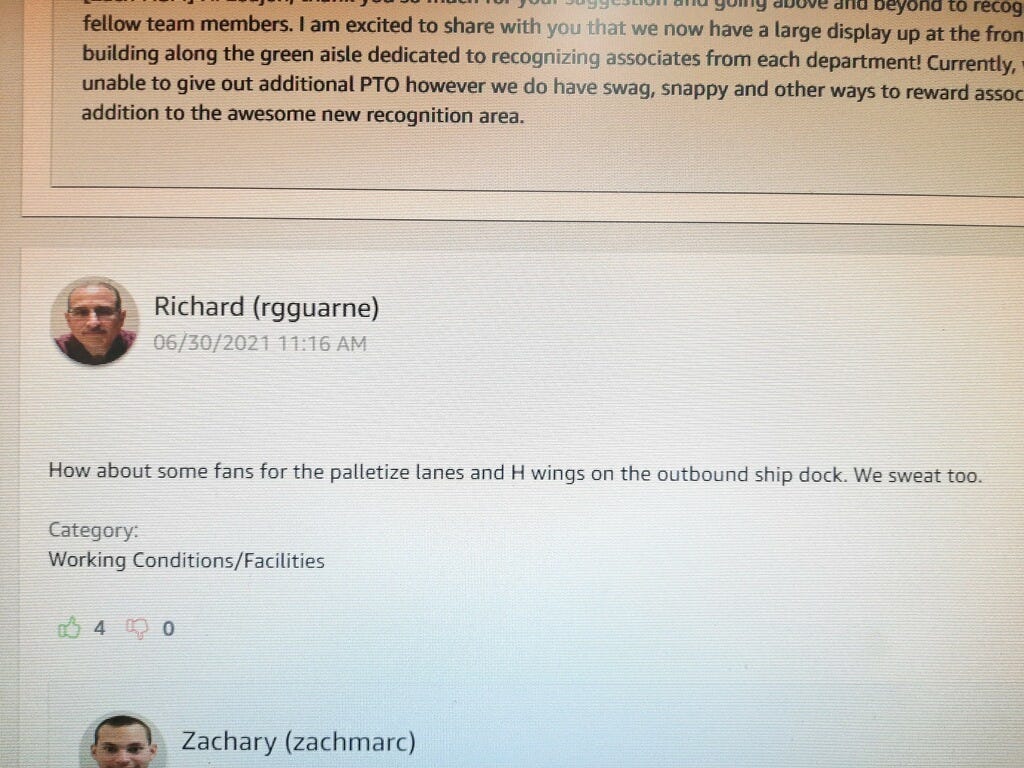 “How about some fans for the palletize lanes and H wings on the outbound ship dock. We sweat too,” Richard wrote.