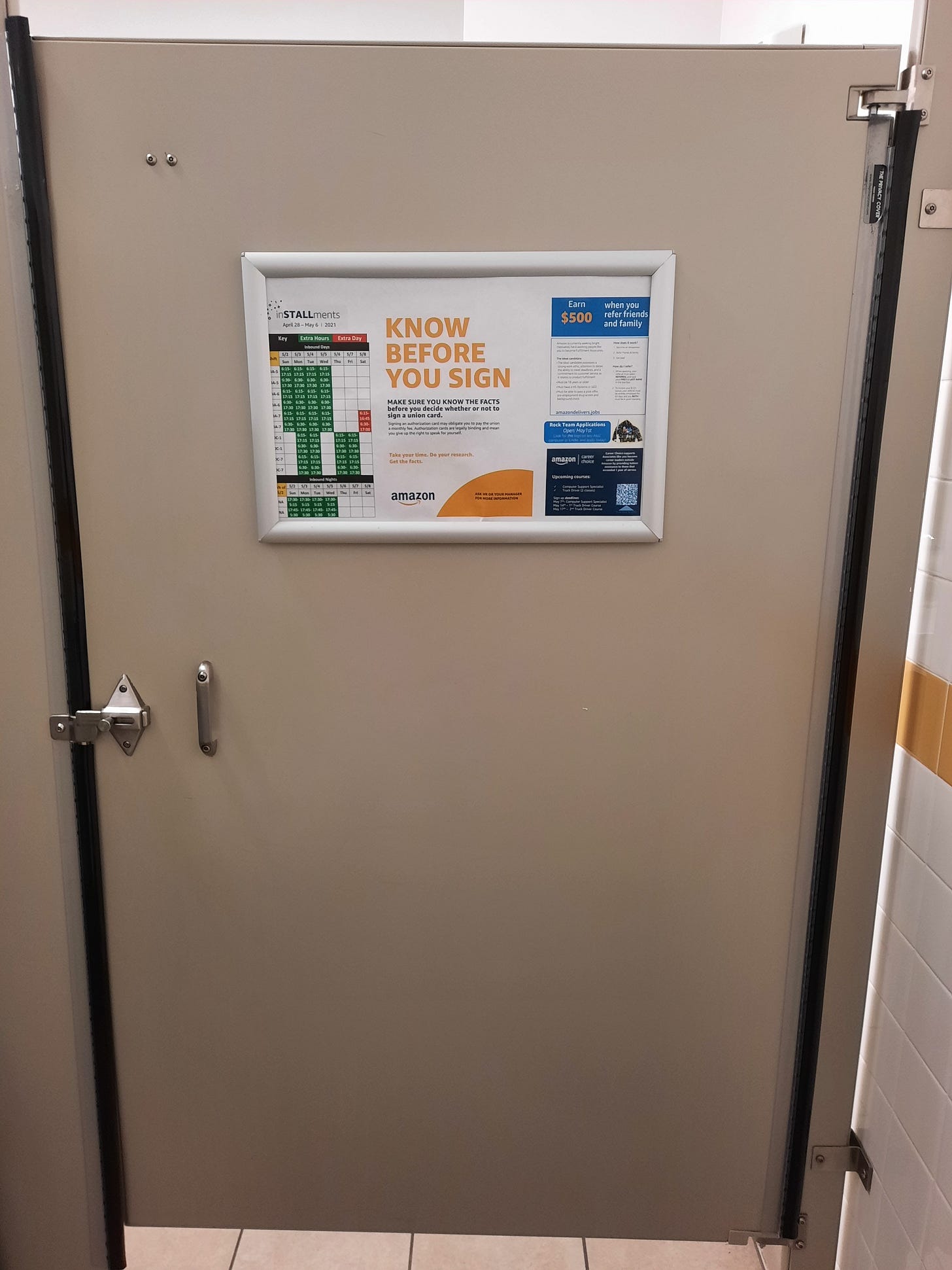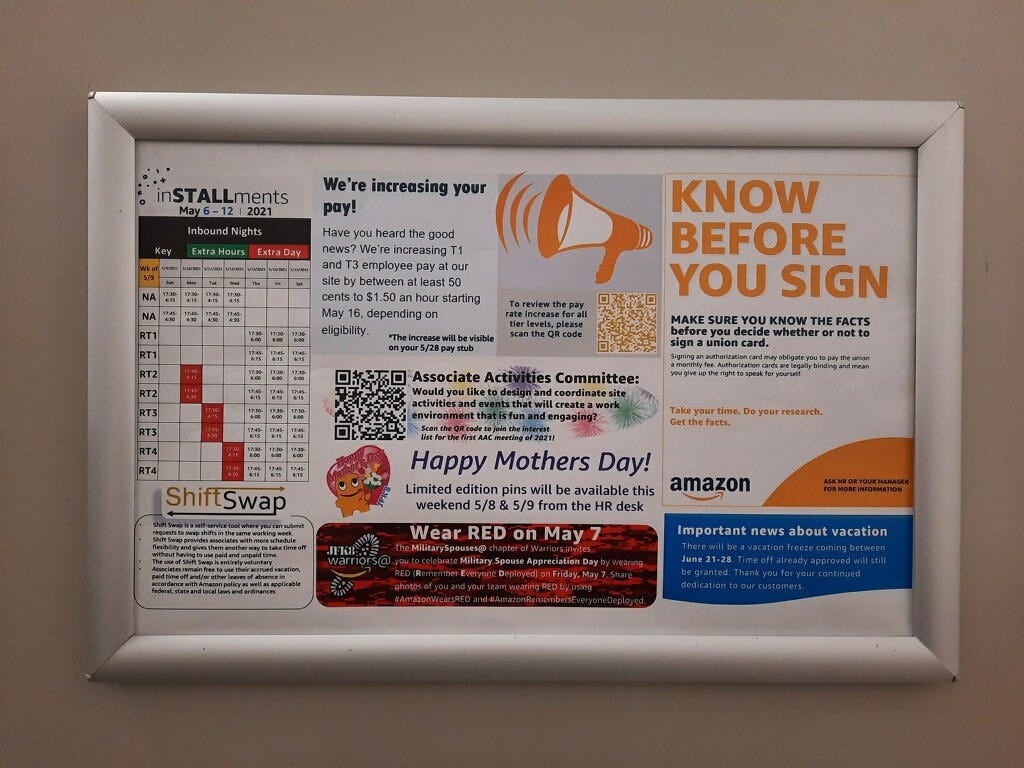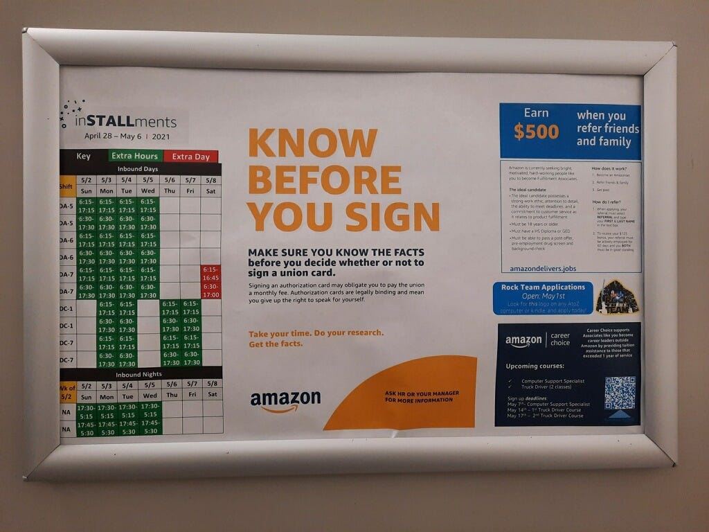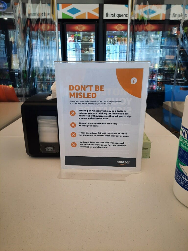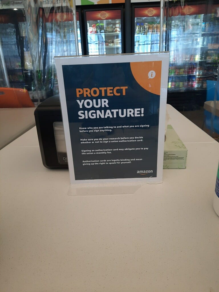 “Organizers may even call you or try to visit your home!” the sign reads, adding that “no leader from Amazon will ever approach you outside of work or ask you for personal information and signature.”