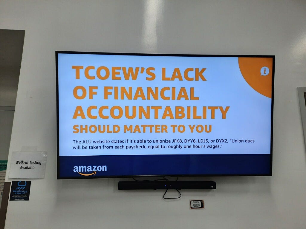 “TCOEW’s lack of financial accountability should matter to you,” a TV-screen message says, adding that ALU’s website says “union dues will be taken from each paycheck, equal to roughly one hour’s wages” if they are able to successfully unionize.