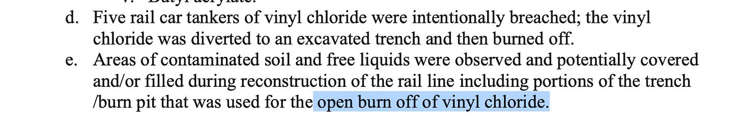 “Areas of contaminated soil and free liquids were observed and potentially covered and/or filled during reconstruction of the rail line including portions of the trench/burn pit that was used for the open burn off of vinyl chloride.”