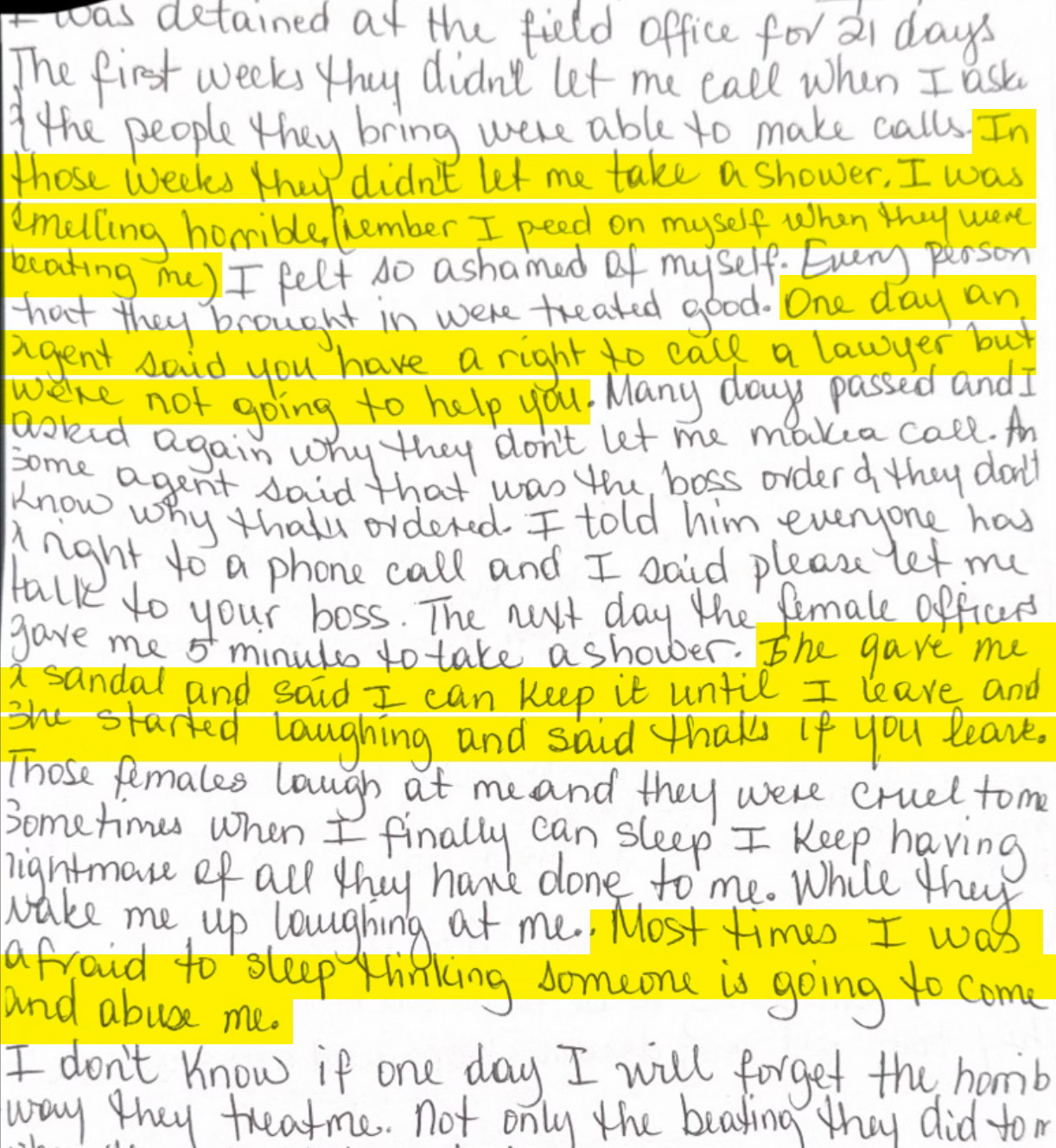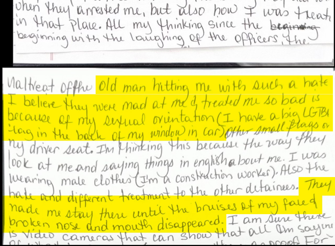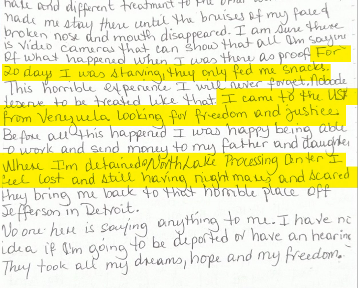 We have also highlighted certain parts of one female prisoners’ handwritten account of physical abuse and starvation she endured at the local ICE field office she was held at for nearly three weeks before being transferred to North Lake Detention Center.