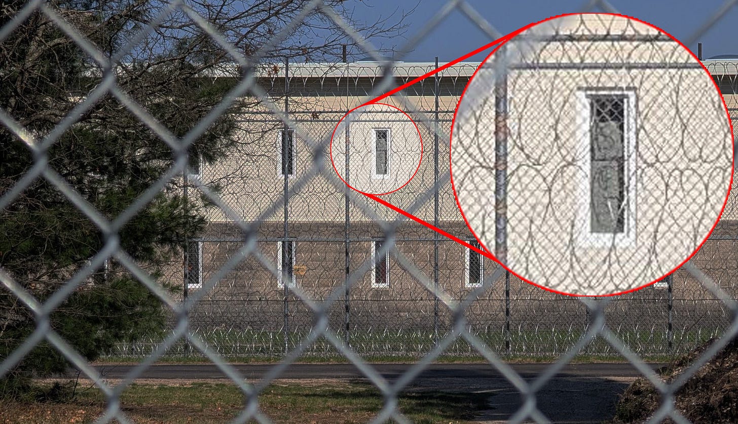 On Tuesday, dozens of supporters gathered for a solidarity rally outside the rural-area ICE prison to show solidarity with prisoners. In response, female prisoners held up signs in the window that spelled out the distress signal SOS. Status Coup obtained a photo (red circle added by us). See below.