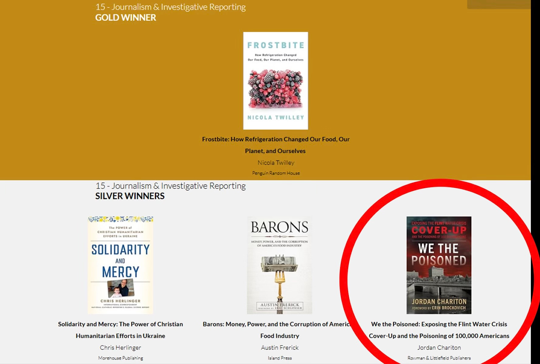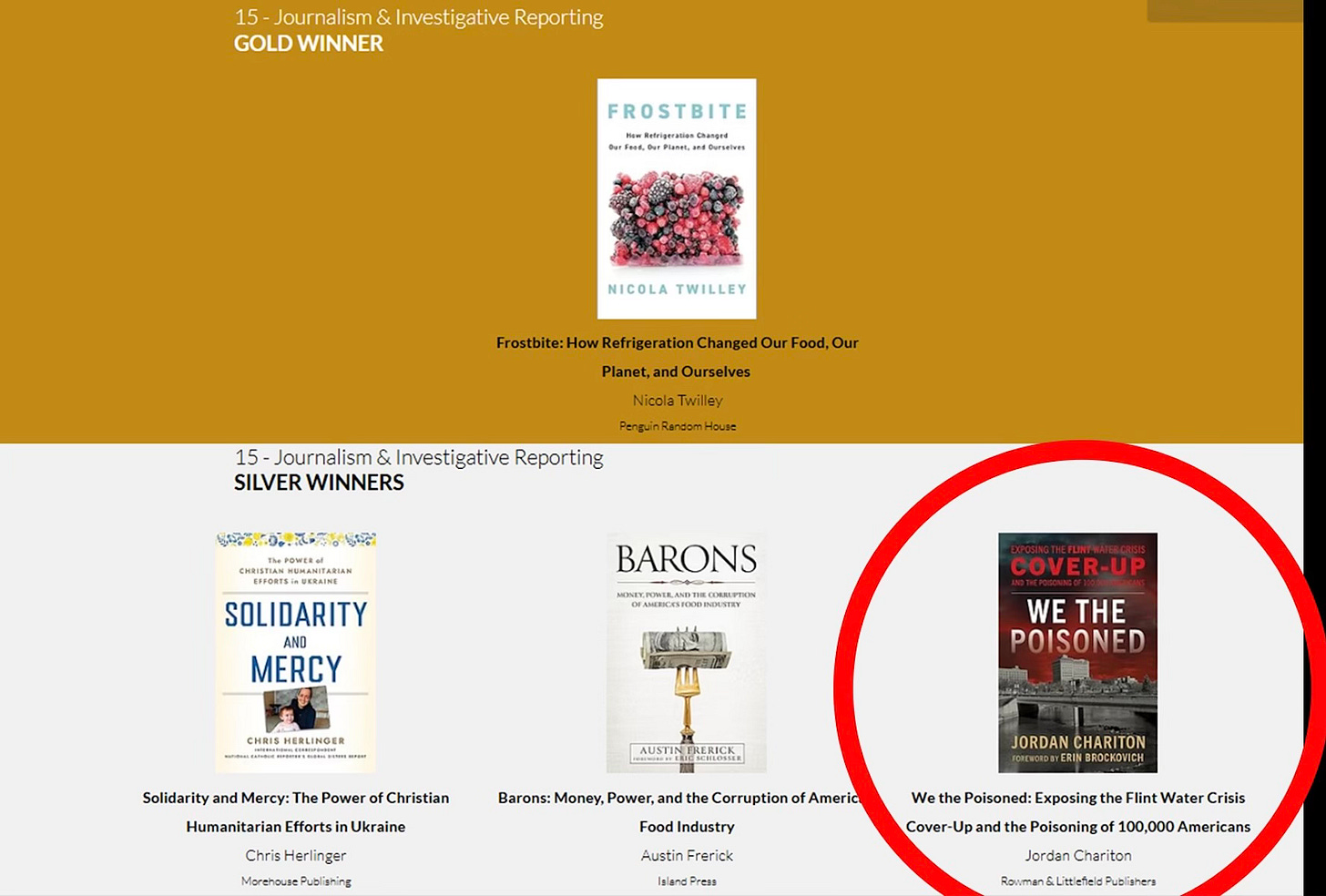 This means my book exposing the Flint water cover-up beat out hundreds of other entries to earn runner up for the best book in the journalism and investigative reporting category. The book, which is based on my nine years of reporting on Flint, exposed a sprawling government cover-up that led to the poisoning of Flint, including: political payoffs, destruction of evidence, witness tampering, surveillance of Flint residents, and more.