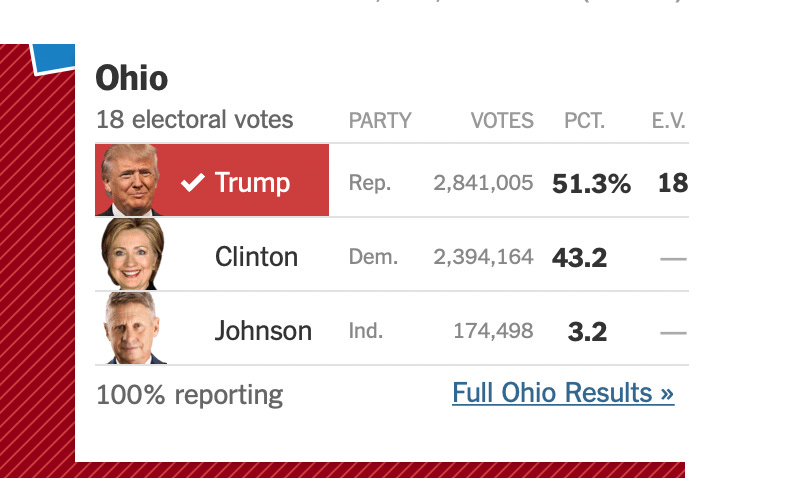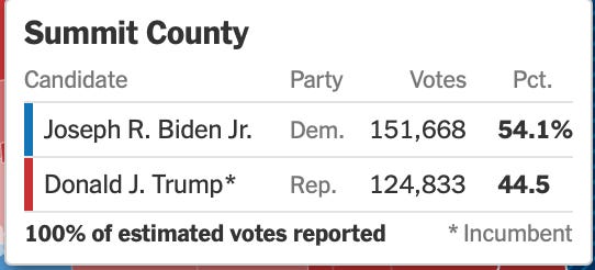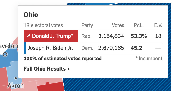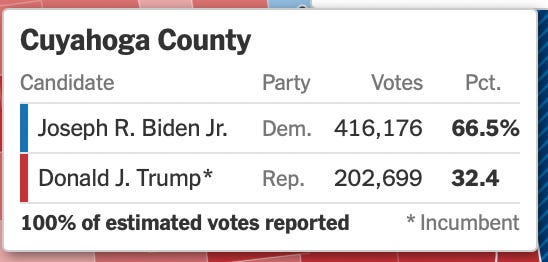 Fast forward to 2020, President Trump again won Ohio by eight points again. But Biden won Cuyahoga County (Cleveland) by 34 points and Summit County (Akron) by 10 points.
