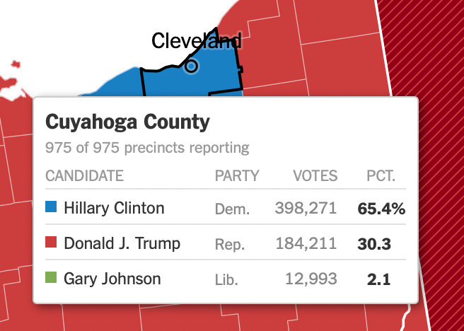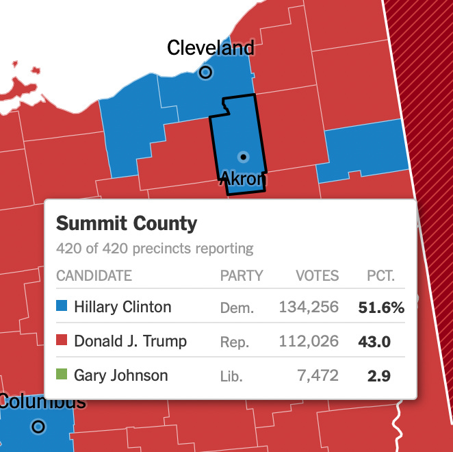 Despite Trump winning Ohio by eight points, Hillary Clinton won Cuyahoga County (Cleveland) by 35 points and Summit County (Akron) by eight points.