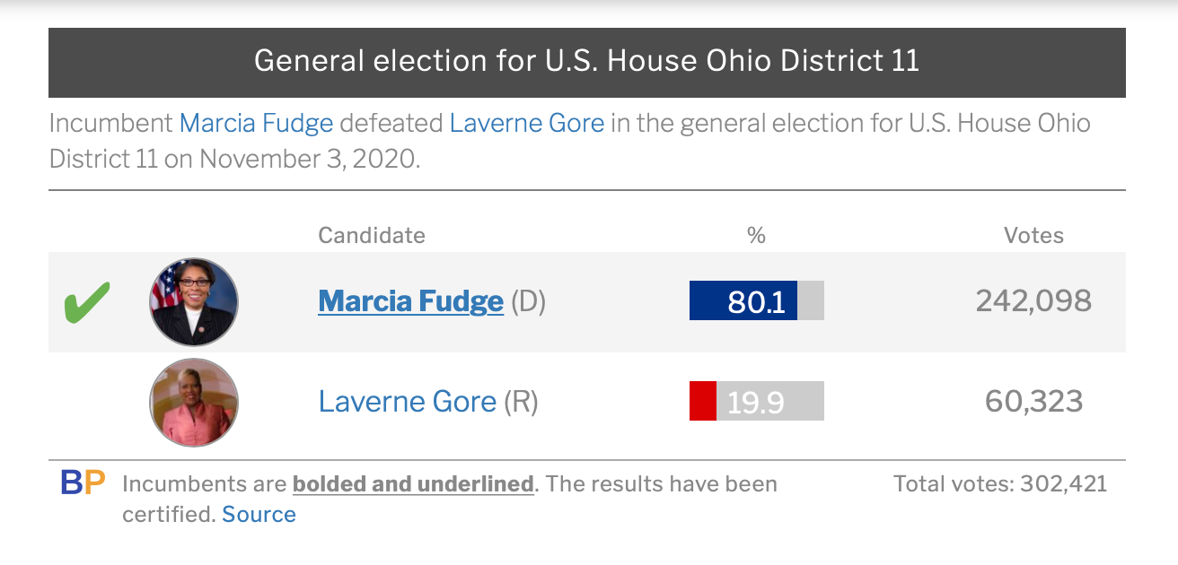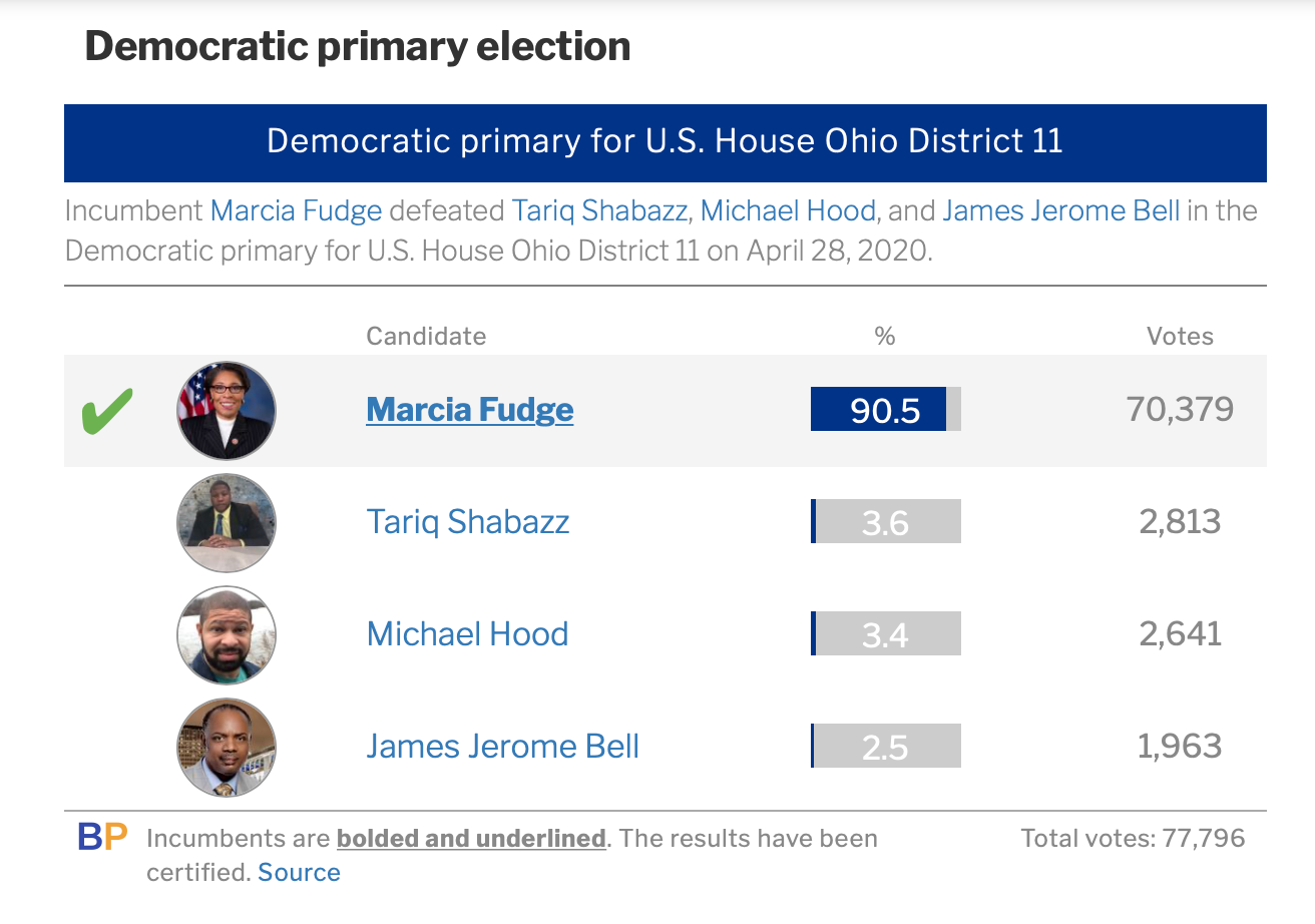I give you the 2020 OH-11 Democratic Primary and general election results showing then- Democratic congresswoman Marcia Fudge (now HUD Secretary) demolishing all challengers.