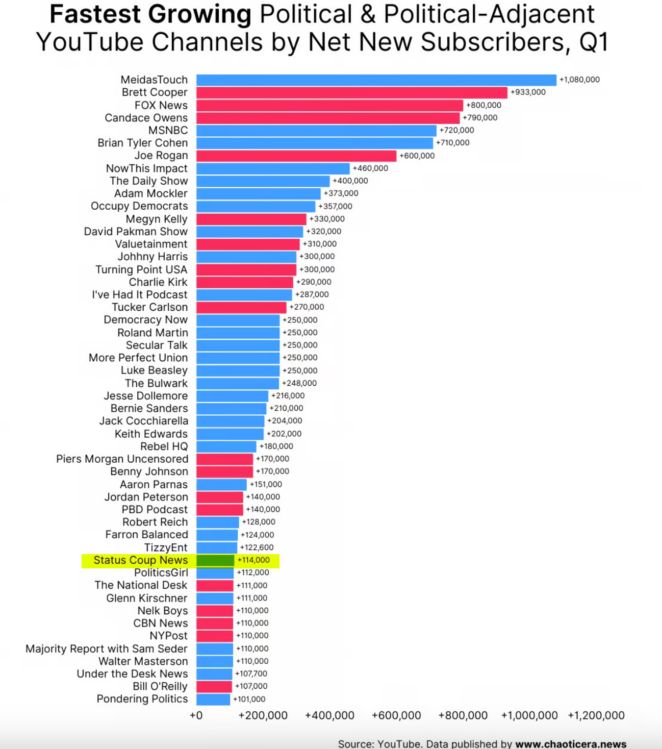 Excited to share the news that Status Coup made the list of fastest-growing political channels on YouTube for the first three months of 2025 (see below).
