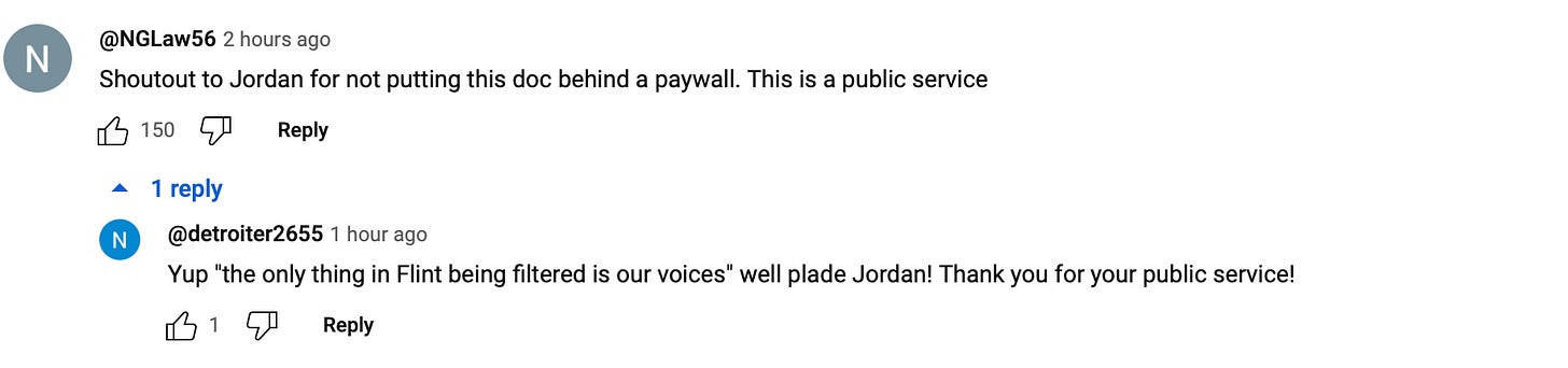 Yesterday, we released our “Flint Fatigue” documentary marking the decade anniversary of the ONGOING, ACTIVE Flint water crisis—and cover-up. The documentary can be seen for free on Breaking Points YouTube channel and on our Flint Fatigue website. Paying Status Coup members can watch the FULL INTERVIEWS we shot for the documentary as well as get behind-the-scenes footage we shot for the documentary—including me accidentally hitting some folks in the face on Wall Street!). You can also donate to help fund this important reporting (creating this film cost us over $5,000 dollars.)